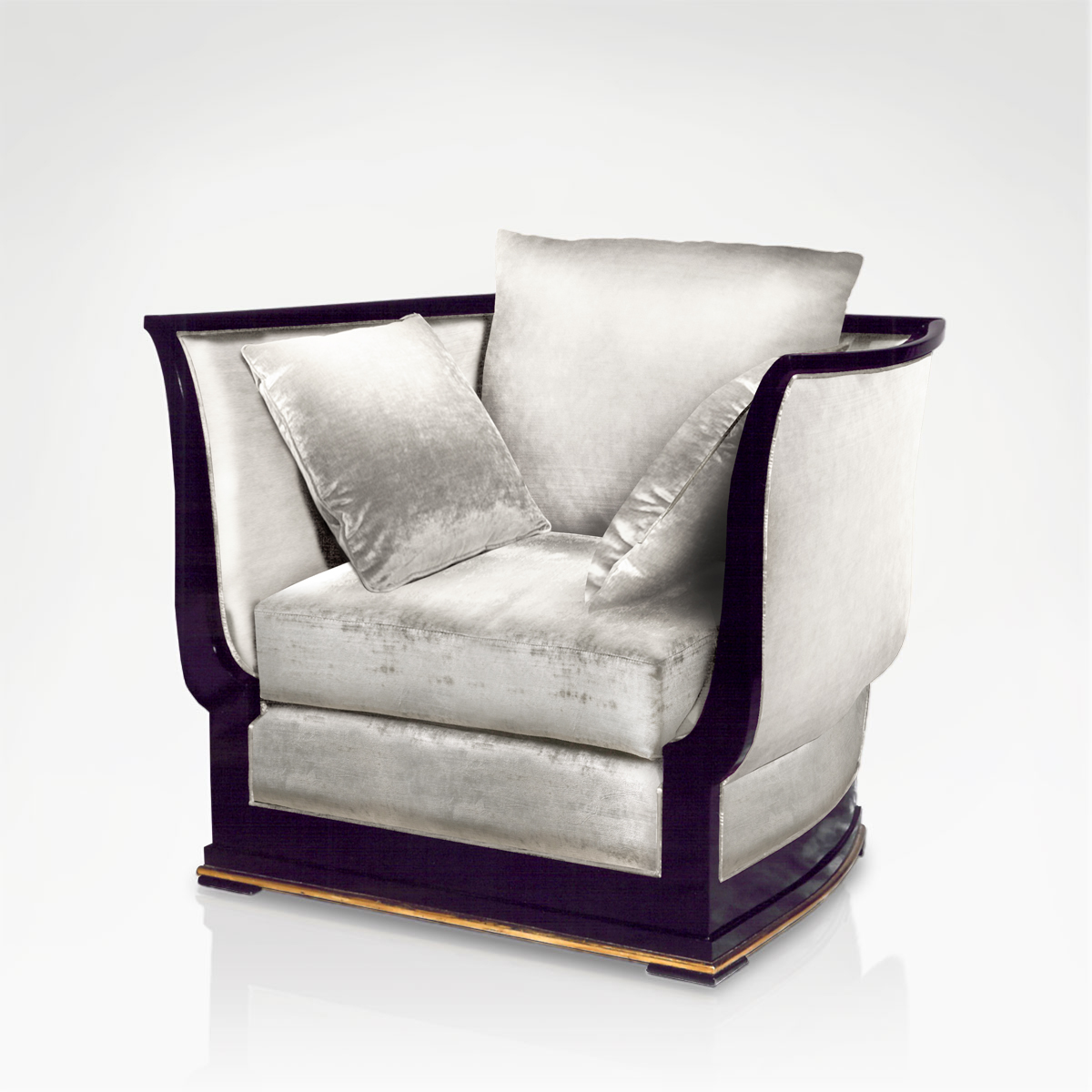 This grand armchair is carefully handcrafted from black lacquer wood and a solid square accented with gold leaf that leads up into high armrests and a curved back. The chair is fully upholstered in fabric and comes with a generous seating cushion and pillows for added comfort. Choose from a wide range of colours.