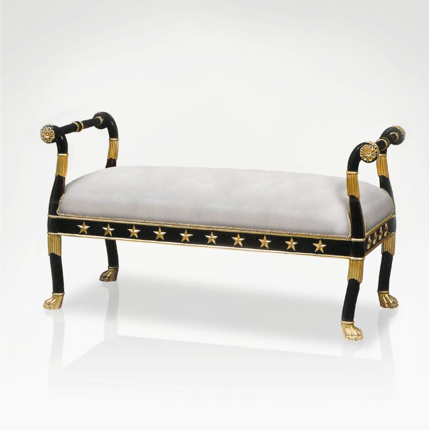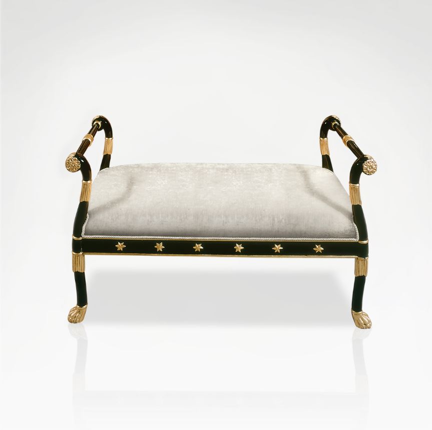 This bench is carefully handcrafted from black lacquer wood, forming a frame raised up on each side by sweeping legs, decorated with touches of gold leaf. The wide seat is cushioned and upholstered in fabric for added comfort. Choose from a wide range of colours.