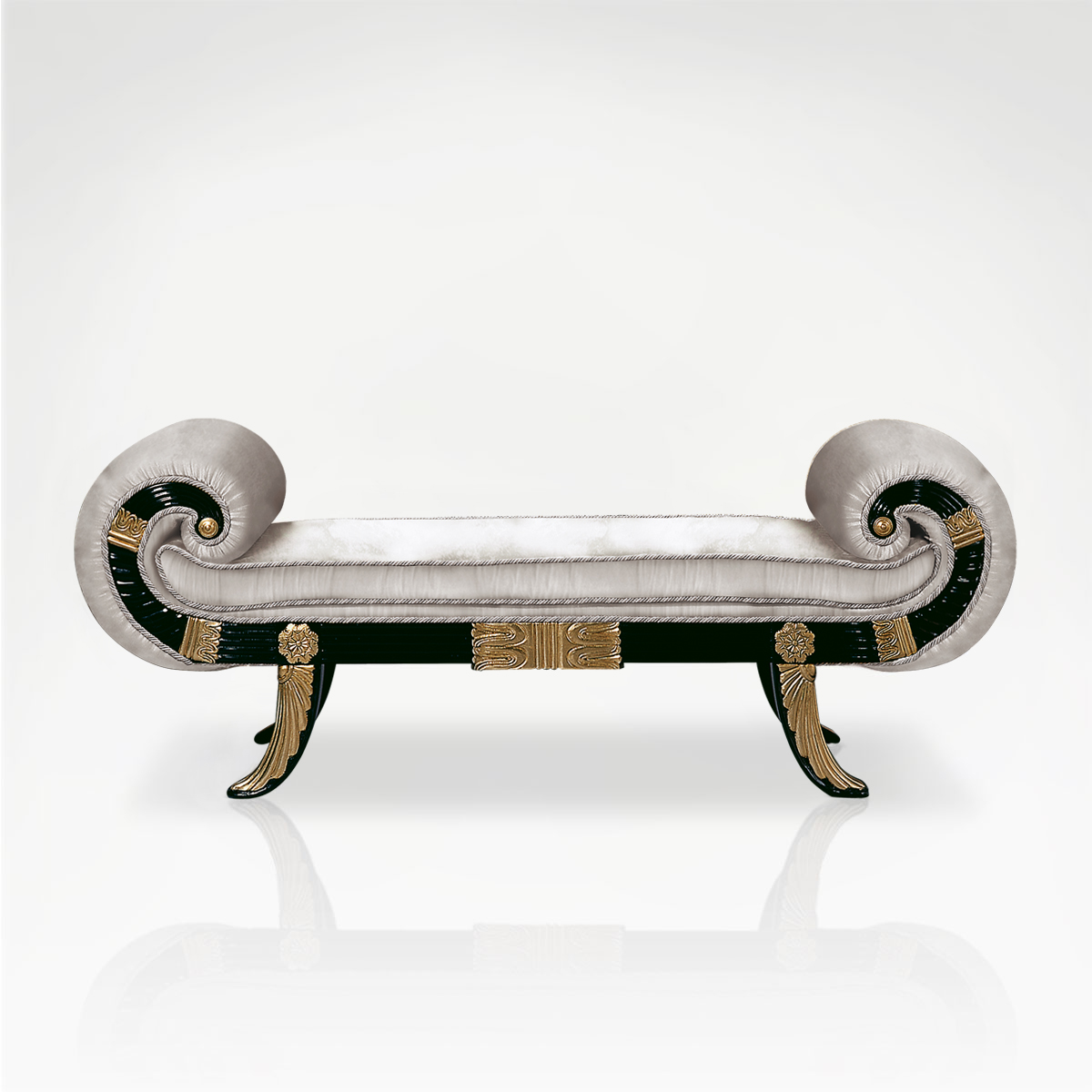 This bench is carefully handcrafted from black lacquer wood and features oversized rolled armrests. The frame is decorated with ornate touches of gold leaf, and the seat and arms are upholstered in fabric. Choose from a wide range of colours.