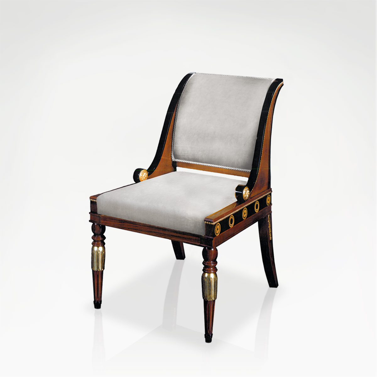 This chair is handcrafted from mahogany and accented with touches of gold leaf and black lacquer wood. The seat and backrest are upholstered in fabric for added comfort. Choose from a wide range of colours.