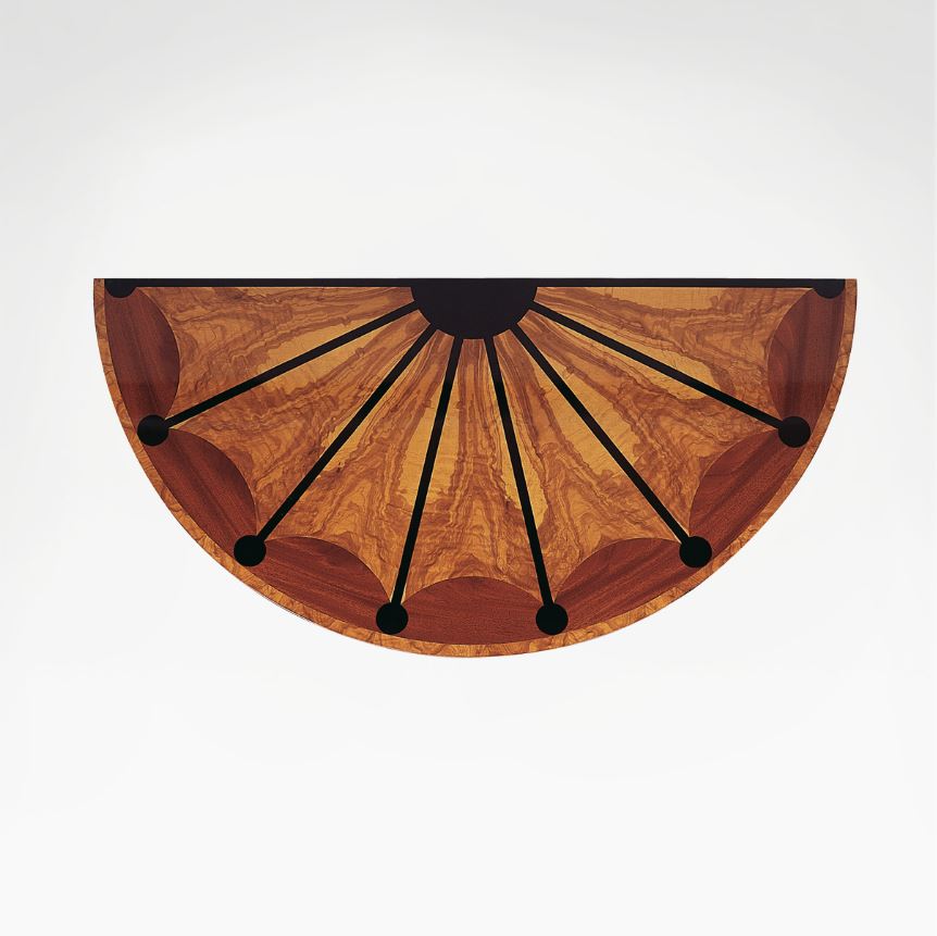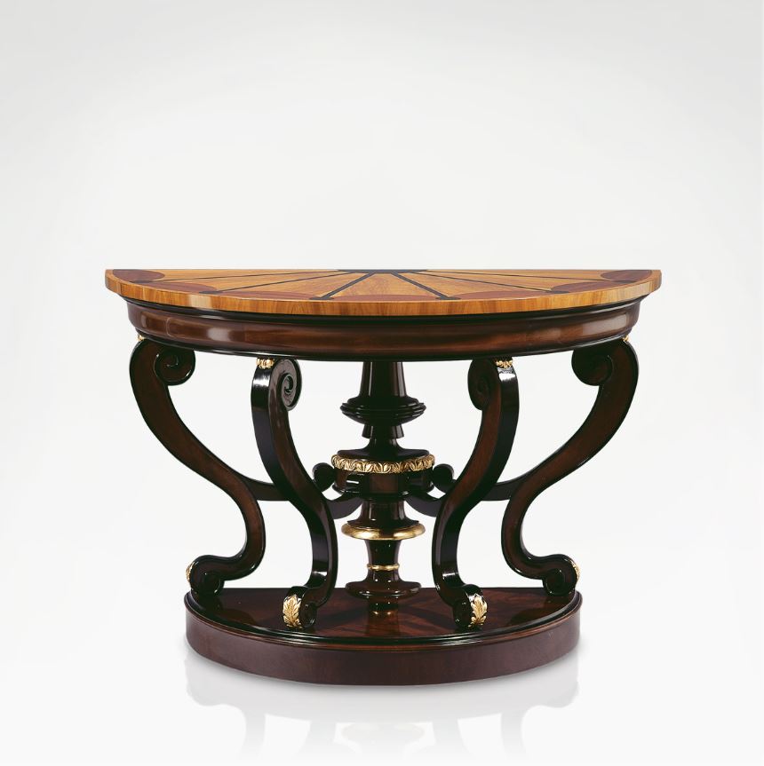 This elegant console rests on a stunning quartet of curved mahogany legs, finishing with rolled feet picked out in gold leaf. The legs sit between a base and plinth also handcrafted from mahogany and edged with black lacquer wood, while the tabletop that brings the console together is solid olive wood, inlayed with mahogany.