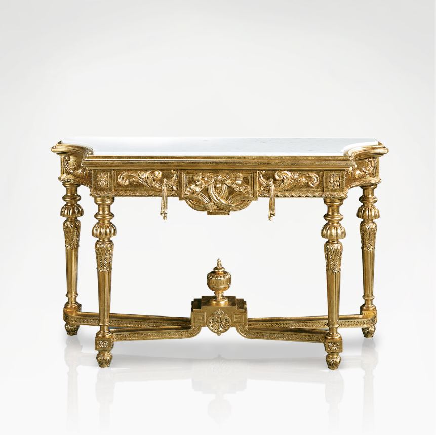 This console is raised up on slender tapered legs decorated with gold leaf that are connected just above their feet by a cross frame support. The tabletop itself, rests on a solid frame of decorative gold leaf that contrasts with the marble surface beautifully.