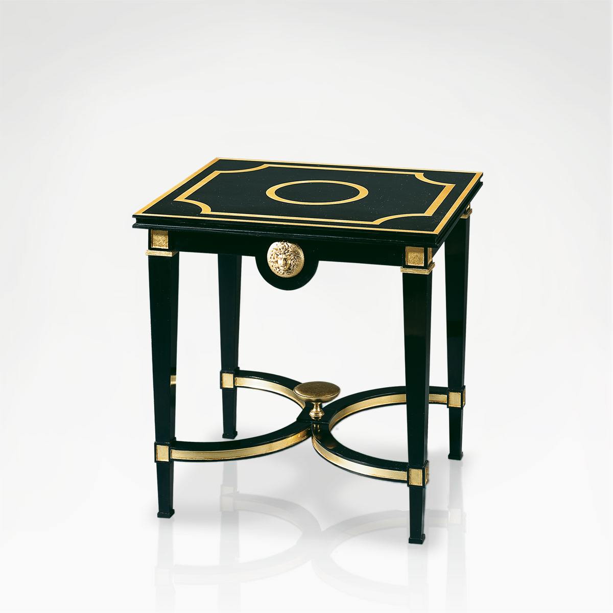This corner table is carefully handcrafted from black lacquer wood and is decorated with gold leaf patterning and sycamore inlay throughout the tabletop, legs, and semicircular leg connectors.