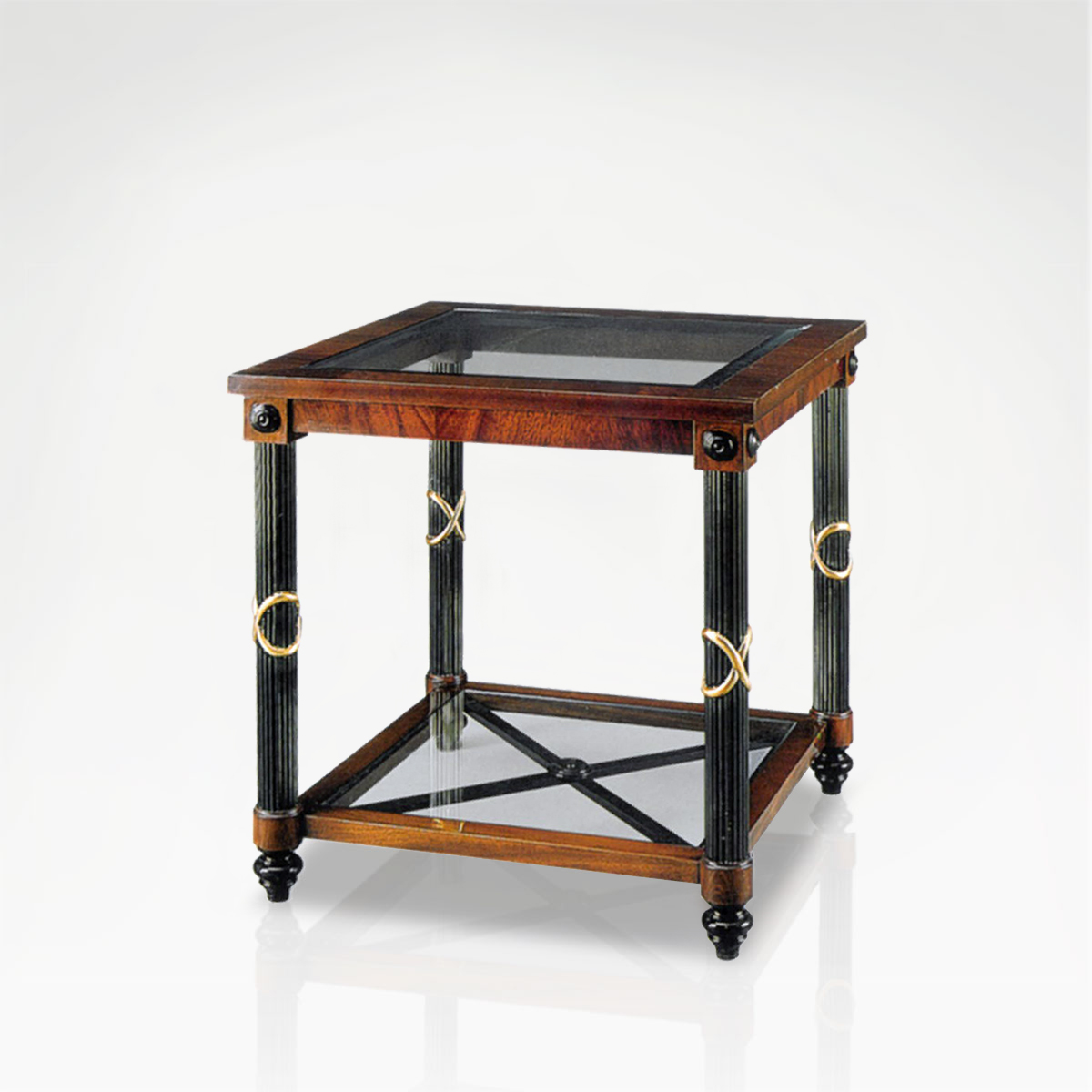 This auxiliary table features a glass tabletop and lower shelf housed in a solid mahogany frame. The frames are separated by slender lined columns of black lacquer wood, decorated with overlapping rings of gold leaf.