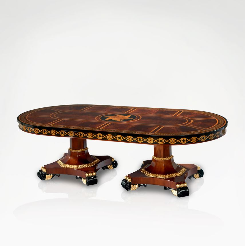 This grand mahogany dining table features a large, oval tabletop decorated with patterns of sycamore inlay, and touches of black lacquer wood at the center that match the black lacquer wood edging. Below the tabletop, two columns lead down to solid bases, each finished with four hand carved feet adorned with touches of gold leaf and further black lacquer wood.