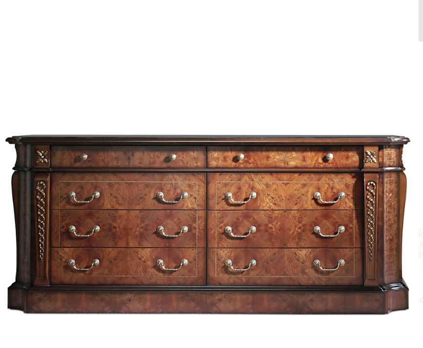 The DALI collection is a full collection of highly elegant and traditional designs marked by the use of wood carvings, gold accent features, and burnished edges to accentuate elegance. Root veneers, marquetry of olivewood and sycamore, gold leaf finish on carvings, brass hardware.