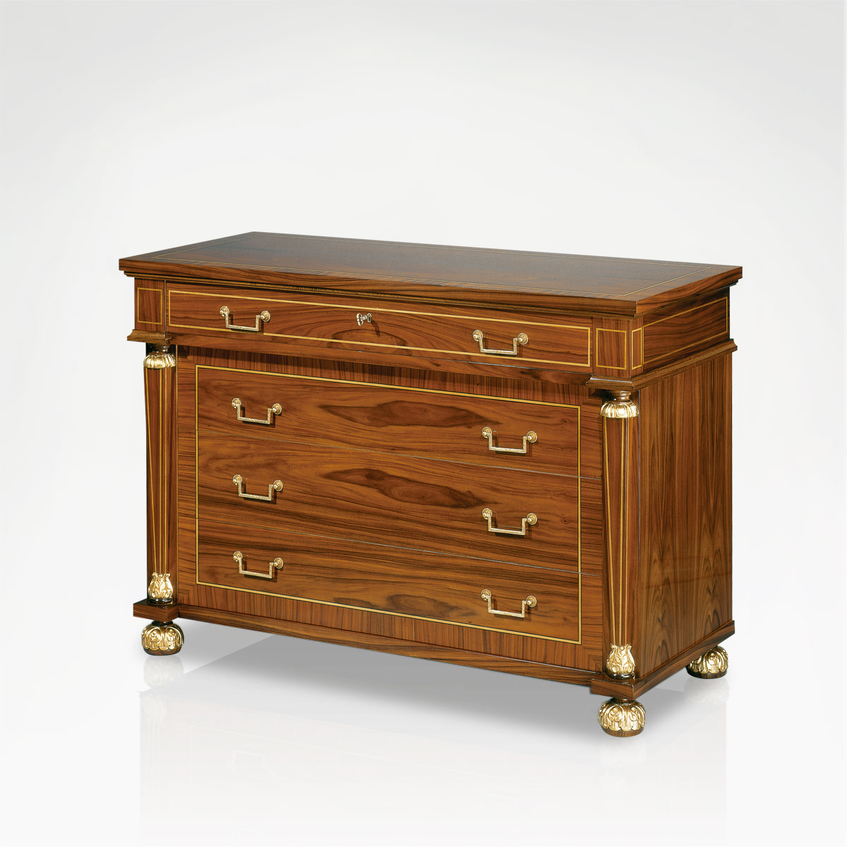 This grand dresser is handcrafted from rosewood and features a tabletop inlaid with delicate sycamore, resting upon a column of four drawers. The dresser is raised up on round, gold leaf feet and bought together by further sycamore inlay framing the fronts of the drawers and legs.
