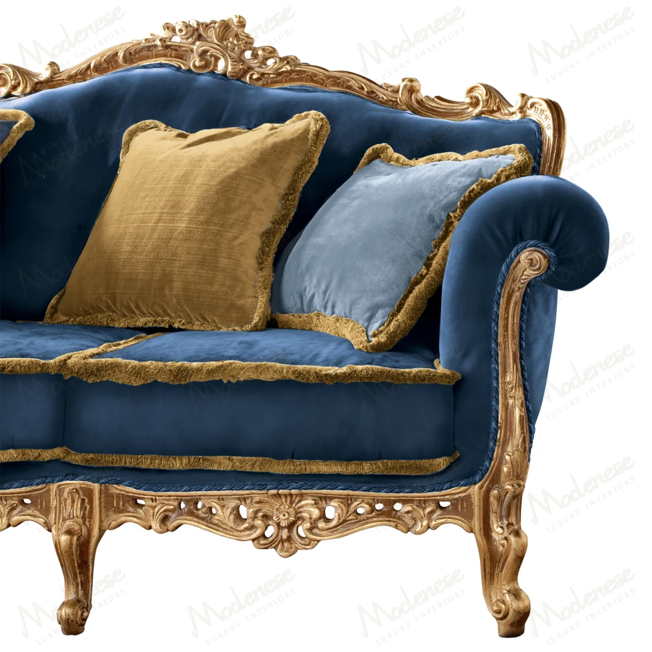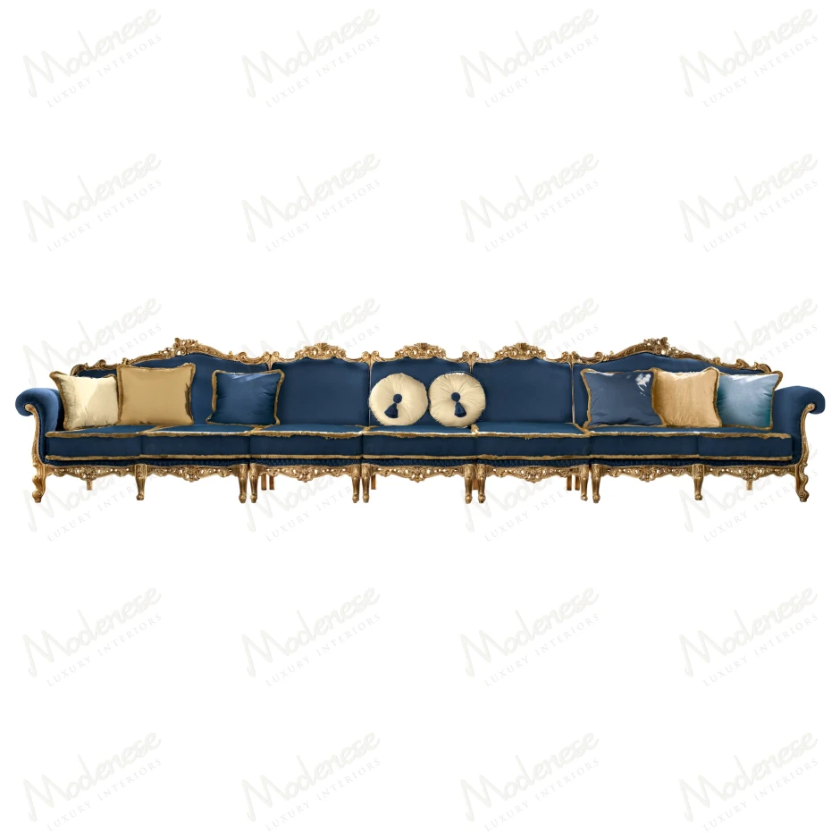 The Eclipse 7-Seater Sofa is a statement of timeless grandeur, combining luxurious royal blue velvet upholstery with intricately hand-carved gold-leaf details. Designed to impress, this majestic piece features a regal silhouette enriched by a curated selection of decorative cushions in coordinated tones of cream, gold, and blue. Ideal for elegant salons and living rooms, it offers comfort and magnificence in perfect harmony.