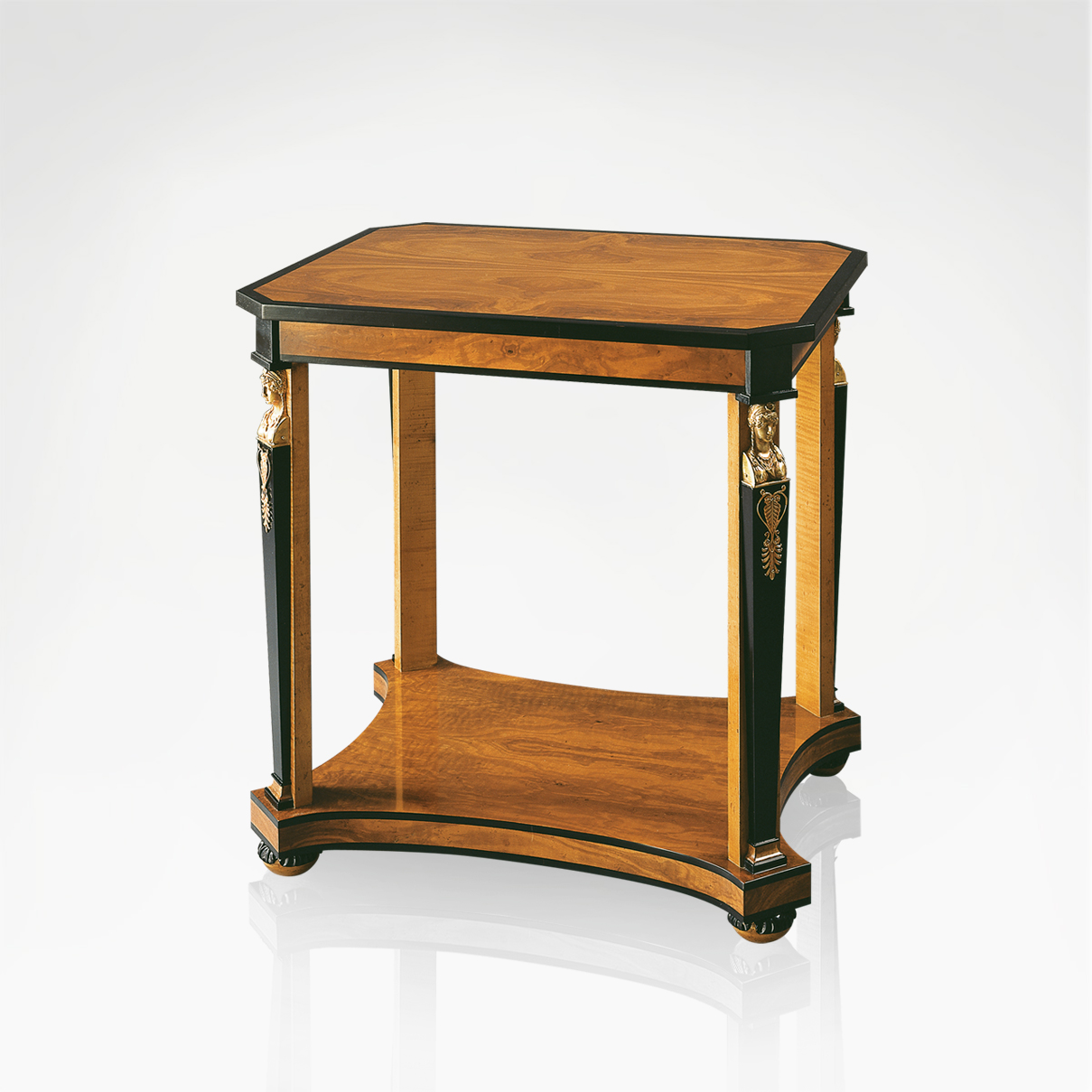This auxiliary table is handcrafted from olive wood and is comprised of three sweeping legs that taper off from a tabletop edged and decorated in black. The four legs in olive wood and black laquer with brass.
