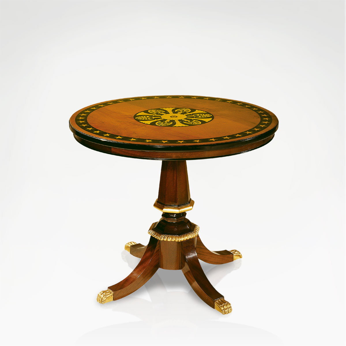 This stylish mahogany end table rests on four splayed legs, tipped with gold leaf feet. The legs lead up to a central column that supports a circular tabletop, edged with black lacquer wood and decorated with sycamore inlay.