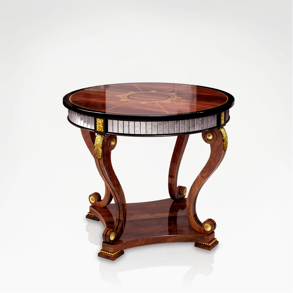 This end table is comprised of a circular mahogany tabletop, leading down to four slender supports that finish at each corner of a base that rests on offset square feet. The tabletop is decorated with patterns of sycamore inlay and edged with black lacquer wood and mirrored panelling, while the supports and base are finished with touches of delicate gold leaf.