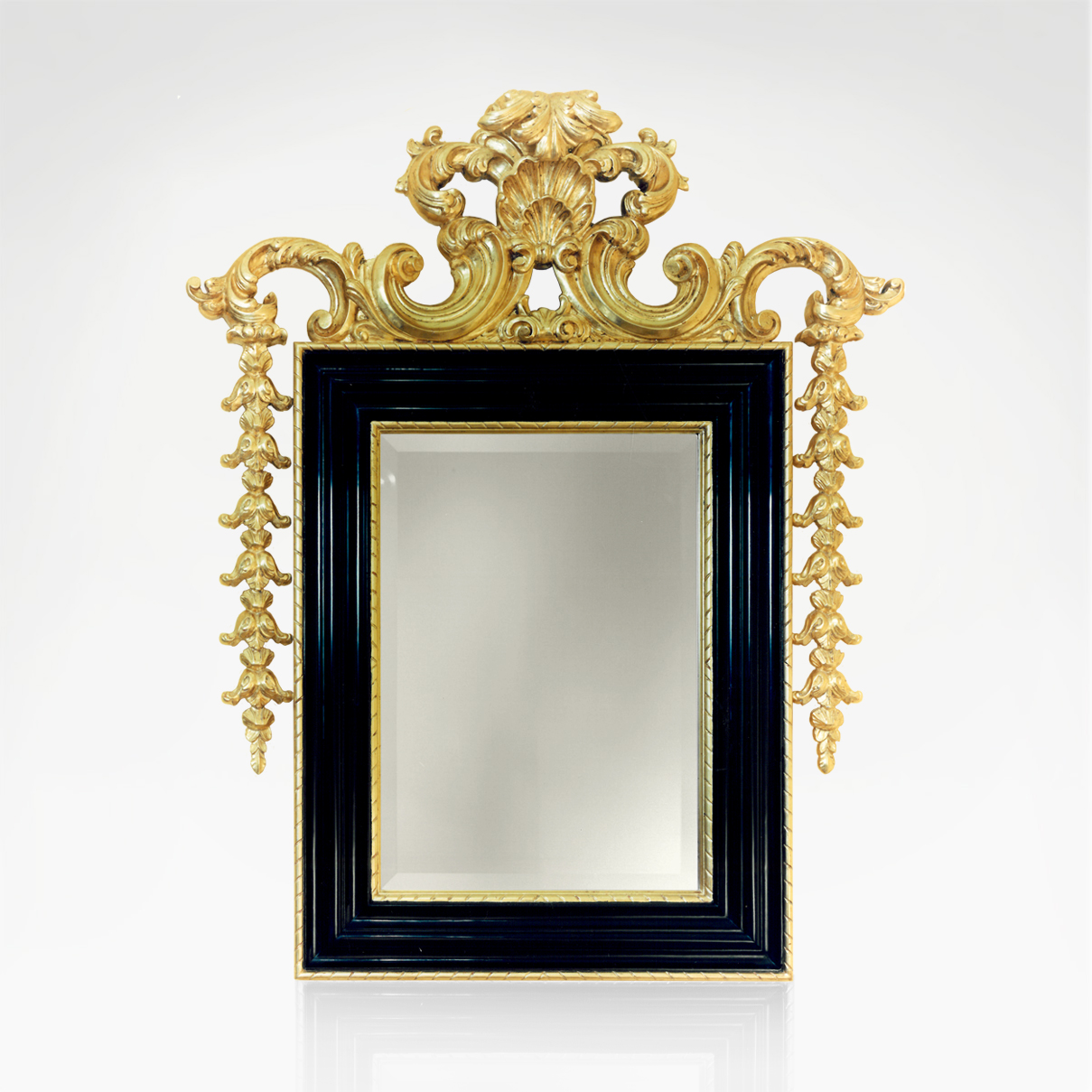 Wooden structure in black lacquered, gold leaf carvings and mirror.
