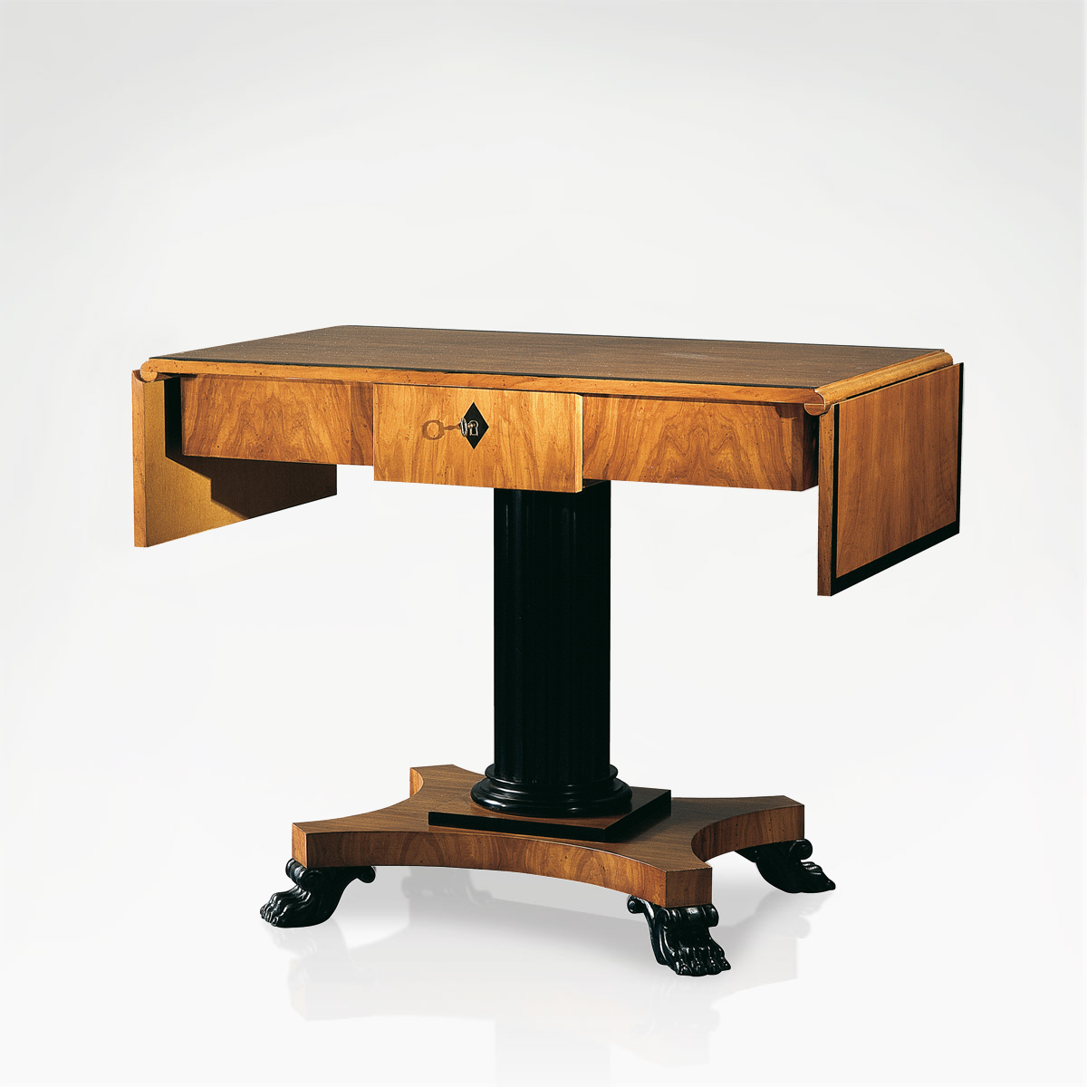 This pembroke table is handcrafted from olive wood, but rests on elegant black lacquer wood feet, and a central column of black lacquer wood that striking contrasts with the lighter body of the piece.