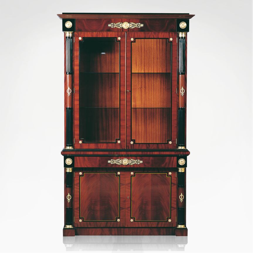 This elegant showcase is carefully handcrafted from mahogany and adorned with supportive columns of black lacquer wood running up either side. The columns frame a pair of cupboards on the lower level, their doors similarly inlayed with black and sycamore marquetry, brass and a pair of glass display doors above, open on to three glass shelves.