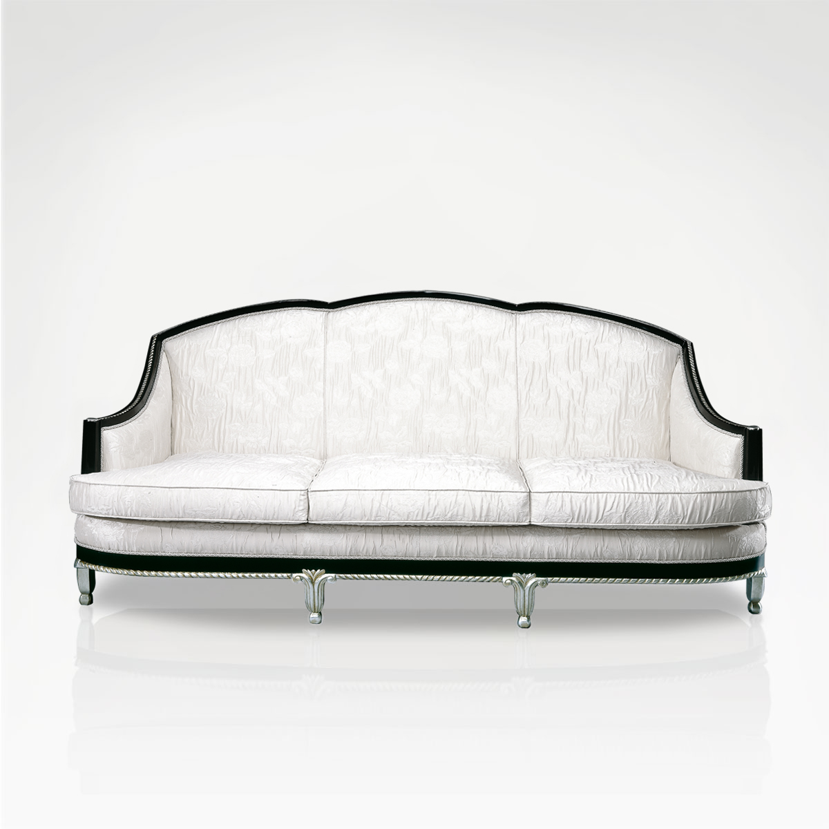 This sofa is comprised of a striking black lacquer wood frame, raised up on tapered silver leaf legs. The seat and sweeping backrest are upholstered in fabric and additional seat cushions are provided for added comfort. Choose from a wide range of colours.