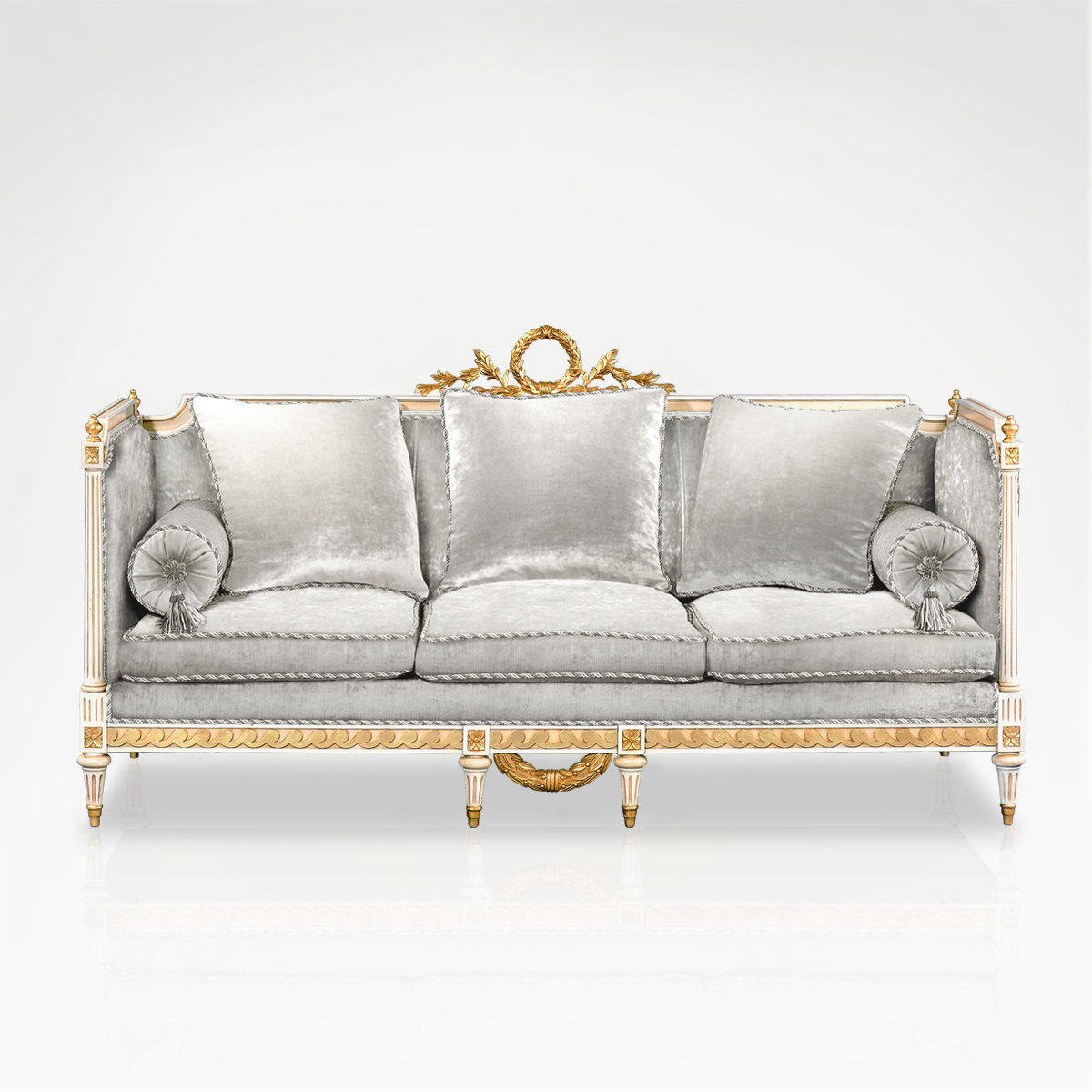 This sofa sits proud in a majestic gold leaf decorated frame. Within, a fully upholstered back and seat contain a collection of seating cushions and pillows for added comfort. Choose from a wide range of colours.