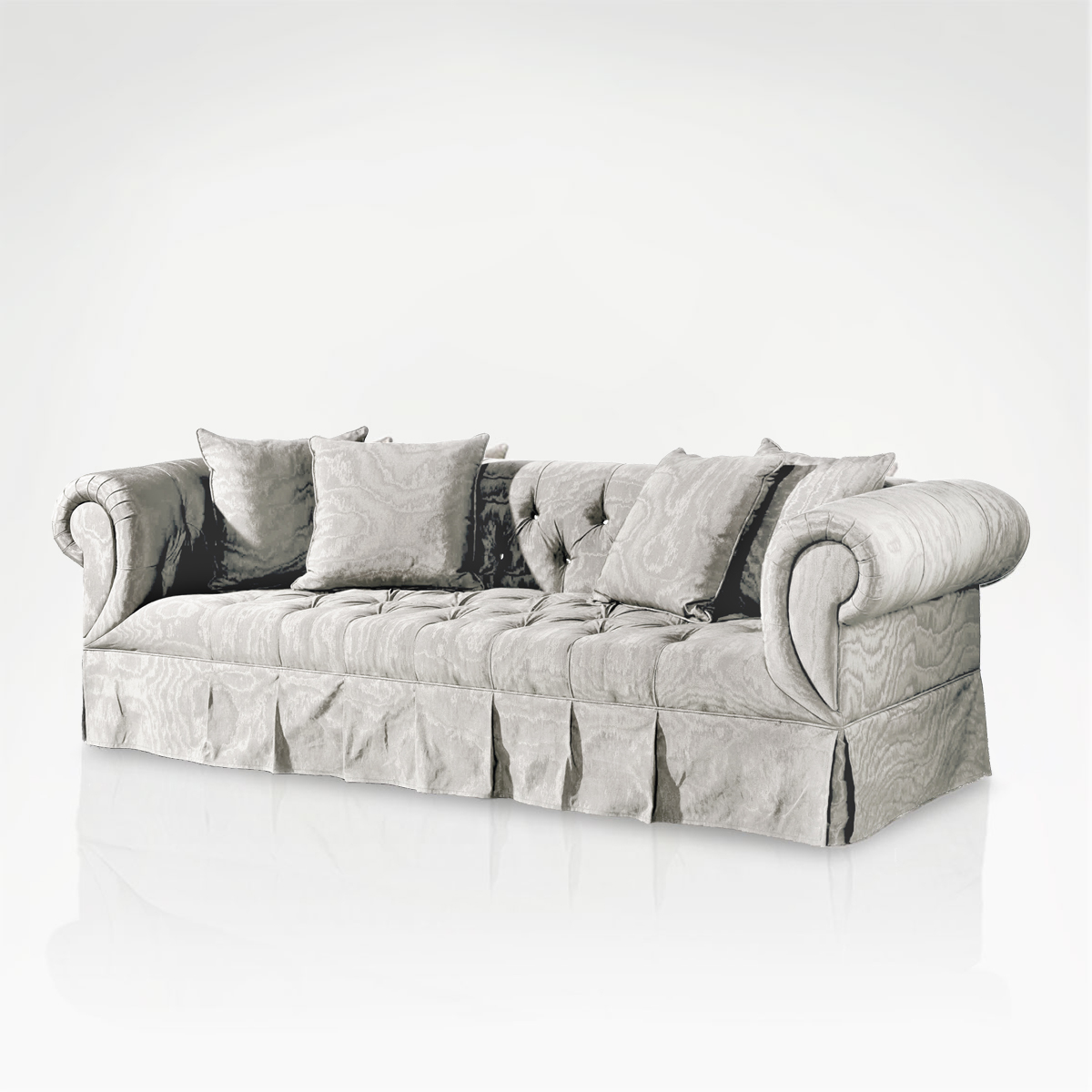 This grand sofa features raised, rolled armrests that lead back into a back button upholstered backrest, replete with four scatter cushions for added comfort. The entire sofa is carefully upholstered in fabric from top to tail. Choose from a wide range of colours.