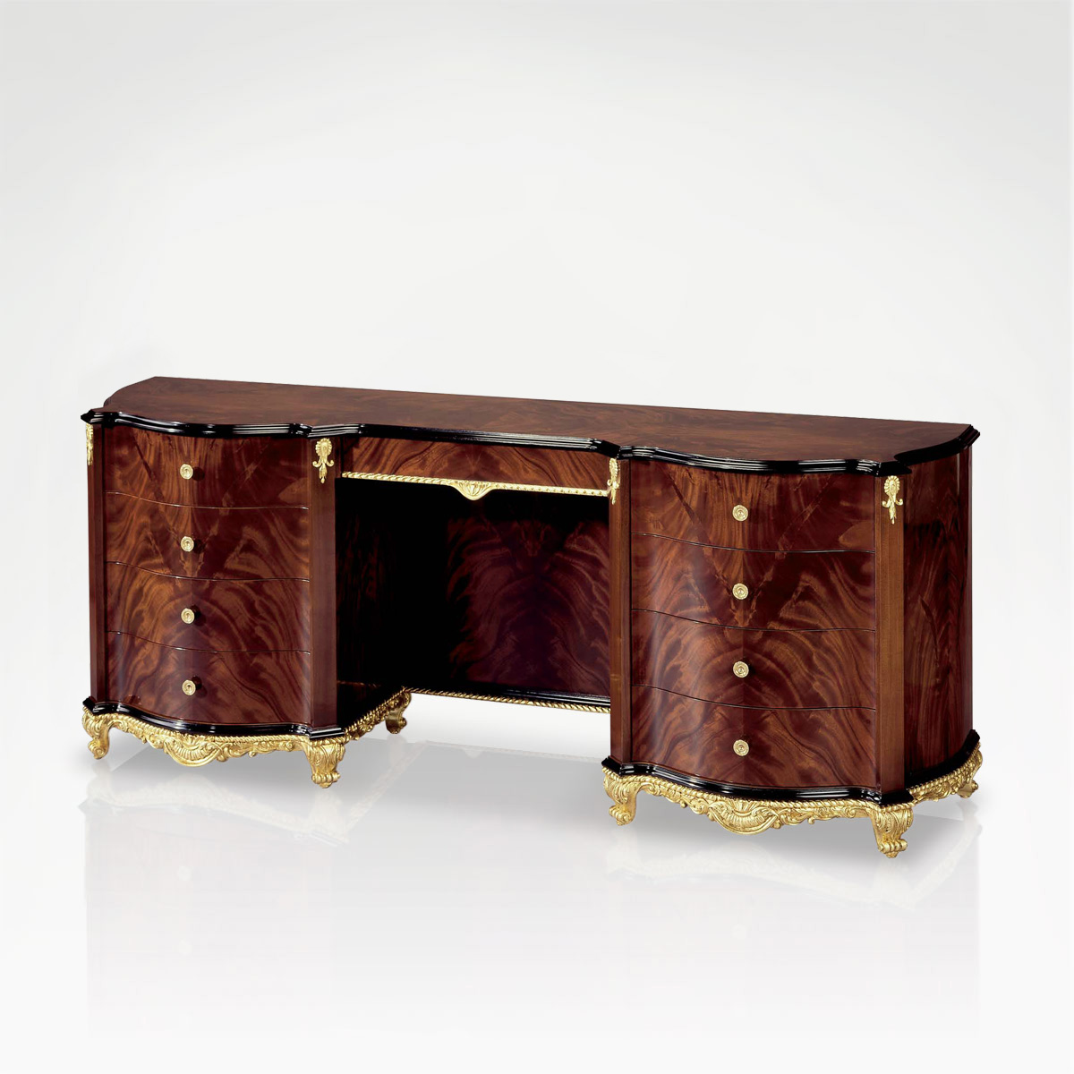 This stylish vanity is handcrafted from mahogany and comprised of two curved columns of drawers flanking a central sitting space. The upper and lower edges of the vanity are picked out in black lacquer wood and the unit rests on a stunning gold leaf base.