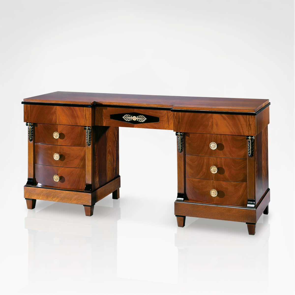 This elegant mahogany vanity is raised up on solid tapered feet, leading up to two columns of three drawers that sit either side of the sitting space. Above, the tabletop is separated from the body by a band of black lacquer wood, reflected in further touches of black lacquer wood either side of the drawers. The vanity is finished with gold leaf handles adorning the drawers.